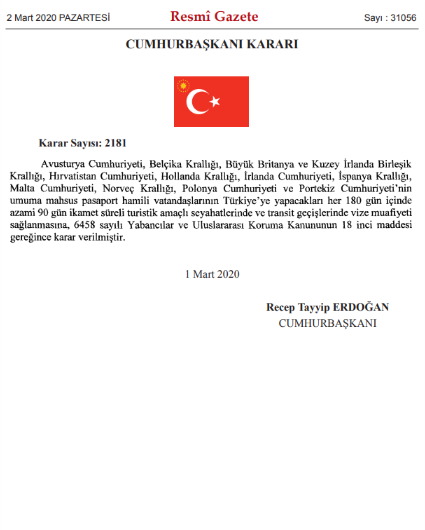Cumhurbaşkanı Recep Tayyip Erdoğan imzasıyla yayımlanan karara göre, Avusturya Cumhuriyeti, Belçika Krallığı, Büyük Britanya ve Kuzey İrlanda Birleşik Krallığı, Hırvatistan Cumhuriyeti, Hollanda Krallığı, İrlanda Cumhuriyeti, İspanya Krallığı, Malta Cumhuriyeti, Norveç Krallığı, Polonya Cumhuriyeti ve Portekiz Cumhuriyeti’nin umuma mahsus pasaport hamili vatandaşlarına Türkiye’ye yapacakları her 180 gün içinde azami 90 gün ikamet süreli turistik amaçlı seyahatlerinde ve transit geçişlerinde vize muafiyeti sağlanacak.