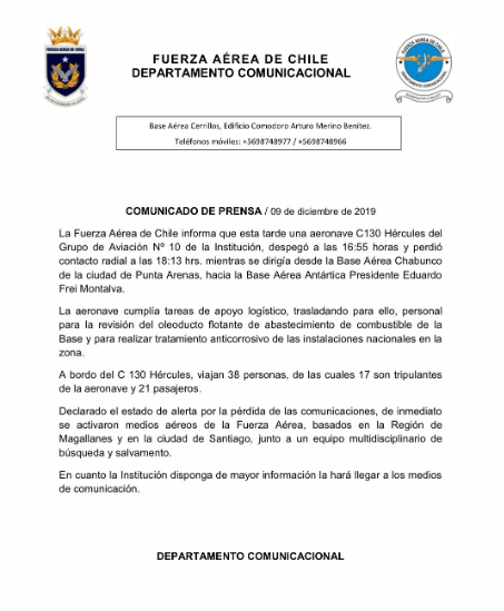 Şili'ye ait askeri uçak Antarktika'daki üsse giderken kayboldu. Şili Hava Kuvvetleri, yaptığı yazılı açıklamada yerel saatle 16:55’te Antarktika’ya gitmek için Punta Arenas bölgesindeki Chabunco Askeri Üssü’nden havalanan askeri uçakla bağlantının, kalkıştan 1 saat 5 dakika sonra kaybedildiğini duyurdu.