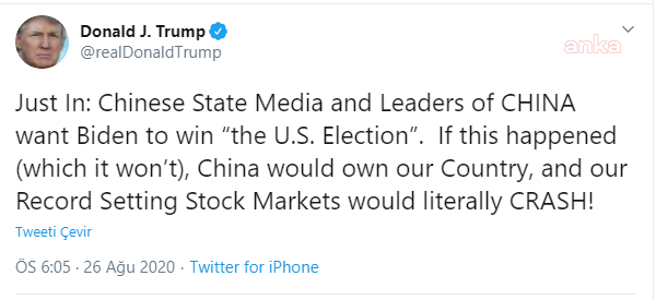 Çin basınında Demokrat Parti'nin adayı Joe Biden lehine haberler çıktığını ve Çin liderlerinin Biden'ı desteklediğini belirten Trump, "Eğer bu gerçekleşirse (ki olmayacak), Çin ülkemize sahip olacak ve rekor kıran borsamız, piyasalarımız tam anlamıyla çökecek" dedi. (anka)