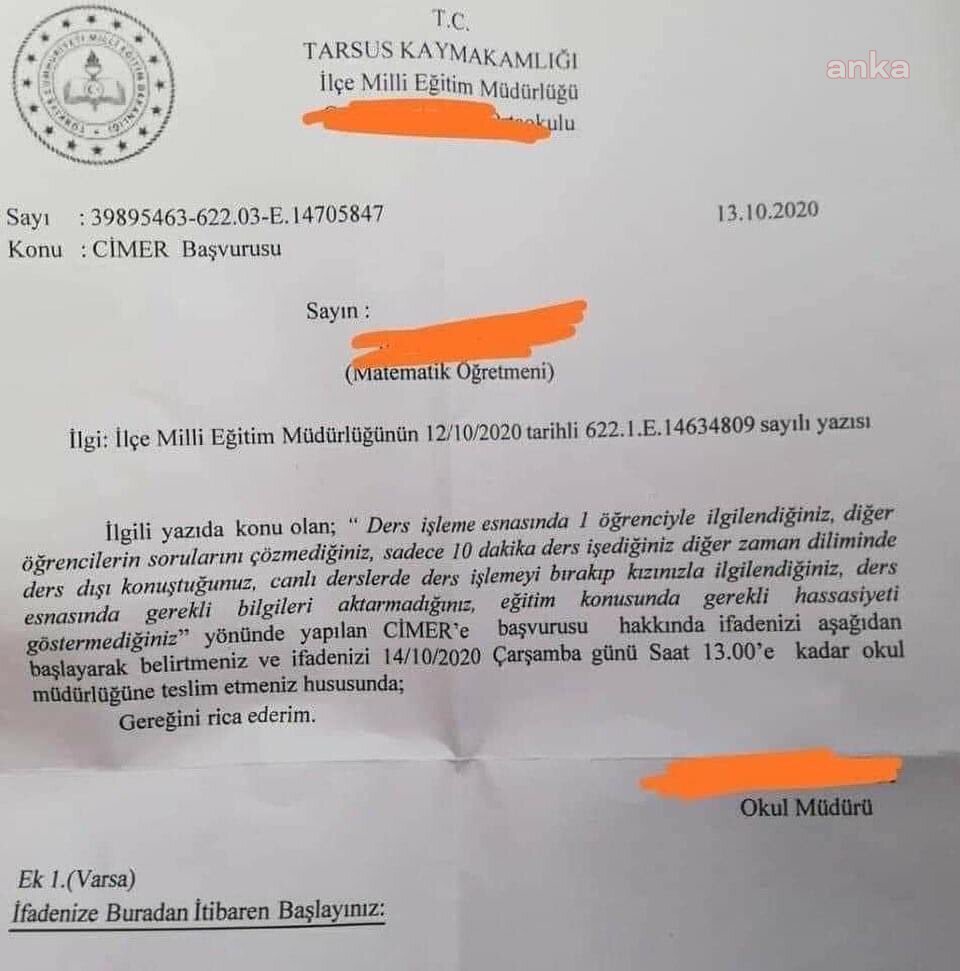 Cimer'e yapılan şikayette, ders işleme esnası sırasında bir öğrenci ile ilgilendiği, sadece 10 dakika ders işleyip, ders dışı konuştuğu, canlı derslerde ders işlemeyi bırakıp kızıyla ilgilendiği, ders esnasında gerekli bilgileri aktarmadığı gibi iddialar yer aldı. 13 Ekim'de yapılan bildirimle 14 Ekim saat 13:00’a kadar ifadesi istenen öğretmen, eline ulaşan yazıyla şok oldu.