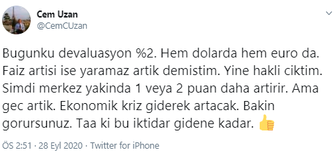 Cem Uzan, "Bugünkü devalüasyon %2. Hem dolarda hem euro da. Faiz artışı işe yaramaz artık demiştim. Yine haklı çıktım. Şimdi merkez yakında 1 veya 2 puan daha artırır. Ama geç artık. Ekonomik kriz giderek artacak. Bakın görürsünüz. Taa ki bu iktidar gidene kadar" ifadelerini kullandı.