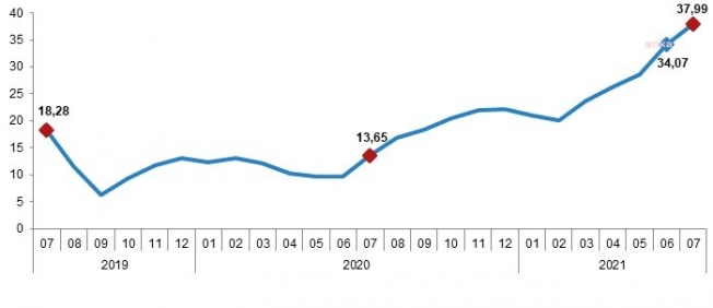 TÜİK, Hizmet Üretici Fiyat Endeksi (H-ÜFE) verilerini paylaştı. H-ÜFE, temmuz ayında bir önceki aya göre yüzde 7,82, bir önceki yılın aralık ayına göre yüzde 30,17, bir önceki yılın aynı ayına göre yüzde 37,99 ve on iki aylık ortalamalara göre yüzde 24,54 artış gösterdi.