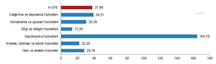 H-ÜFE sektörlerinde yıllık en düşük artış, telekomünikasyon hizmetlerinde yüzde 6,15, büro yönetimi, büro destek ve diğer iş destek hizmetleri yüzde 7,26, yayımcılık hizmetlerinde yüzde 11,69 olarak gerçekleşti. Buna karşılık gayrimenkul hizmetleri yüzde 164,78, su yolu taşımacılığı hizmetleri yüzde 102,01, depolama ve destek hizmetleri (taşımacılık için) yüzde 69,59 ile endekslerin en fazla arttığı alt sektörler oldu.