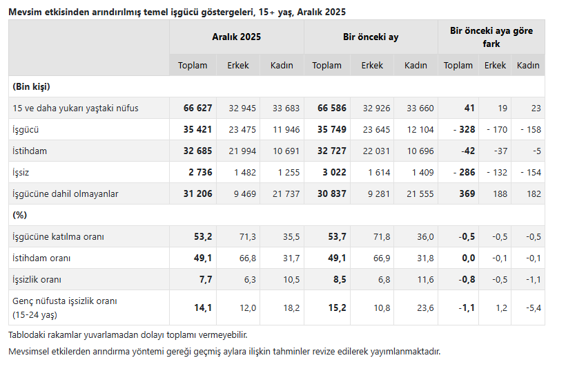 TÜİK'in Aralık 2025'e ait istihdam verilerine göre mevsim etkisinden arındırılmış işsizlik oranı aralık ayında 0,8 puan azalarak yüzde 7,7 seviyesinde gerçekleşti.