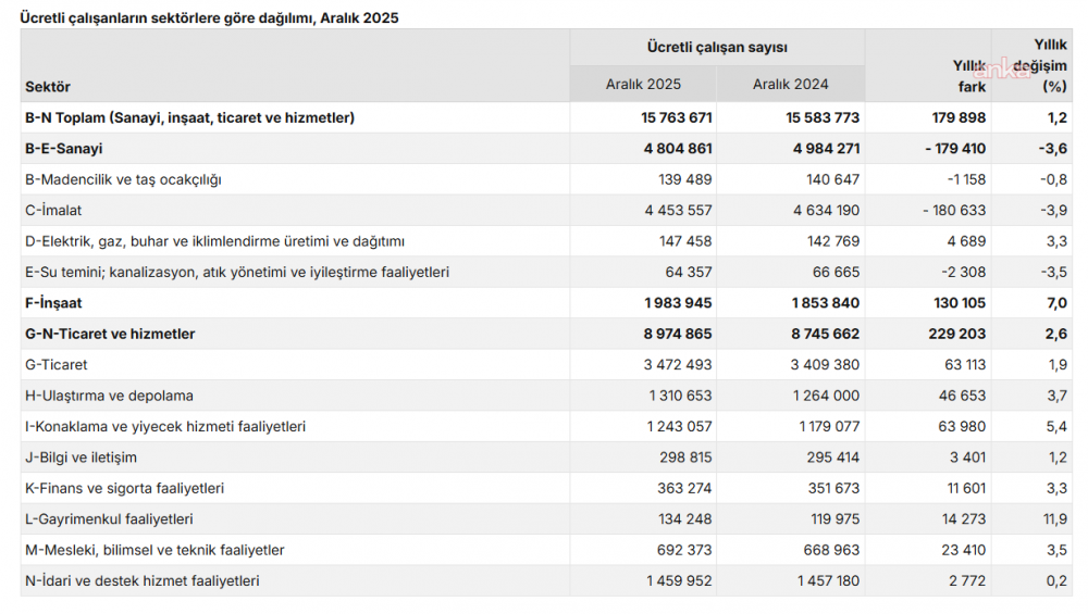 TÜİK'in verilerine göre; sanayi, inşaat ve ticaret-hizmet sektörleri toplamında ücretli çalışan sayısı, 2025 yılı Aralık ayında bir önceki yılın aynı ayına göre yüzde 1,2 arttı. Ücretli çalışan sayısı bir önceki yılın aynı ayında 15 milyon 583 bin 773 kişi iken, 2025 yılı Aralık ayında 15 milyon 763 bin 671 kişi oldu.