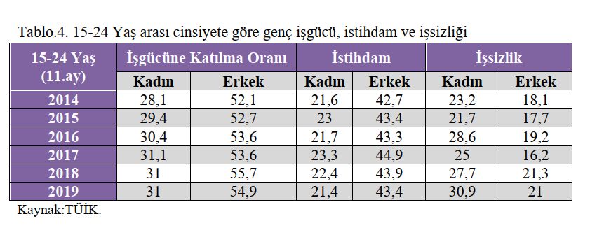 DİSK/GENEL-İŞ Araştırma Dairesi’nin Türkiye’de Kadın Emeği araştırma raporuna göre ülkede işgücü içerisindeki her 10 kadından sadece 3’ü çalışabiliyor ve genç kadın işsizlik oranı yüzde 30.9’ken genç erkeklerin işsizlik oranı yüzde 21.