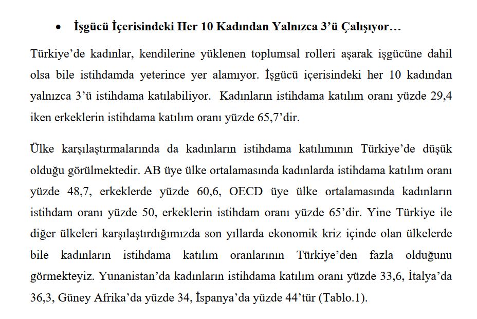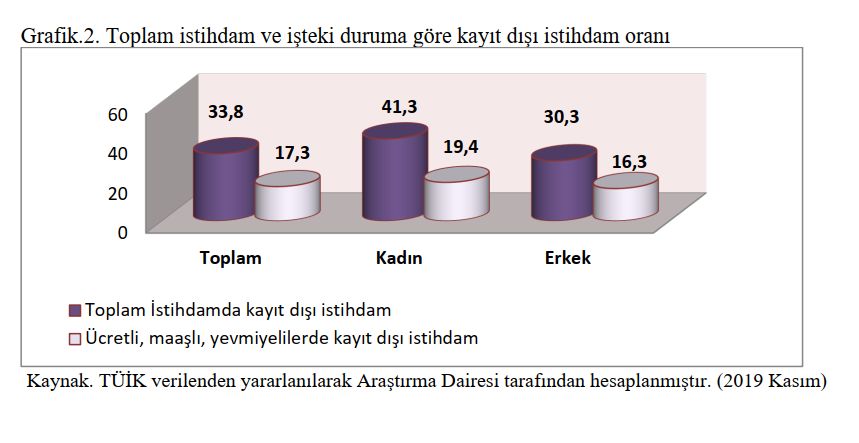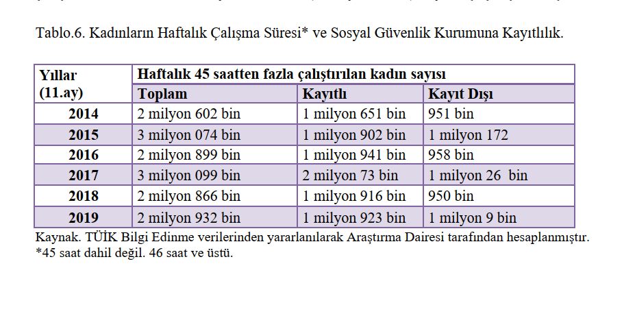 Rapordan veriler şöyle: - 2019 yılında 2 milyon 932 bin kadının haftalık çalışması 45’i geçti ve bu kadınların yüzde 34,4’ü (1 milyon 9 bin) kayıt dışı çalıştırıldı. - 2019 yılı Kasım ayında 2 milyon 596 bin kadın çalıştığı geçici işin bitmesi nedeniyle işsiz kaldığını belirtti. Bununla birlikte çalışan kadınlar içinde ise geçici istihdam edilen kadınların yarıya yakınının kayıt dışı çalıştırıldığı görüldü. Ücretli, maaşlı veya yevmiyeli olarak sürekli işlerde çalışan kadınların kayıt dışı çalıştırma oranı yüzde 16’yken, geçici işlerde çalışan kadınlar için kayıt dışı çalıştırılma oranı yüzde 45’tir.- 2018 yılında erkeklerle kadınlar arasındaki cinsiyete dayalı ücret farkı yüzde 8 olarak gerçekleşti. Yani kadınlar erkeklerden yüzde 8 daha az kazandı. - Erkek nüfusunun yüzde 72.7’si işgücüne katılabilirken, kadın nüfusunun yalnızca yüzde 34.2’si işgücüne katılabildi. AB ve OECD üye ülke ortalamalarına bakıldığında ise kadınların ve erkeklerin işgücüne katılım oranlarının yüzde 52’den fazla.