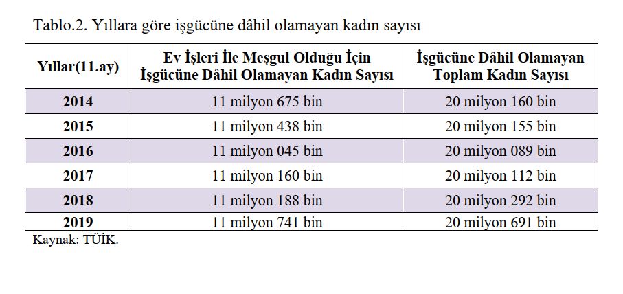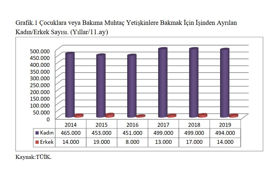 500 bine yakın kadının, evde bakım hizmetleri nedeniyle, işinden ayrıldığına dikkat çekilen raporda, “2014 yılında 465 bin kadın ev içi bakım hizmetlerini sağlamak için işinden ayrılmışken, bu sayı 2019 yılında 29 bin kişi artarak 494 bine ulaştı. Aynı sebeple işinden ayrıldığını belirten erkek sayısı ise kadın sayısının yalnızca yüzde 3’ü kadar” denildi. Raporda “Ev işleri ile meşgul olduğu için çalışma hayatına katılmıyorum” diyen kadın sayısının 11 milyon 741 bin olduğuna dikkat çekildi ve “Bu sayı 2017 yılına kadar azalma eğilimindeyken, krizinin etkisi ile de 2017’den 2019’a 581 bin kişi arttı” açıklamasında bulunuldu.