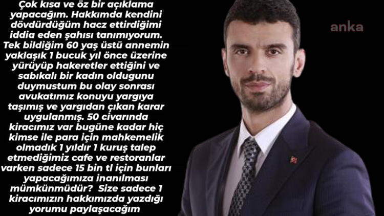 “Çok kısa ve öz bir açıklama yapacağım. Hakkımda kendini dövdürdüğüm ve hacizettirdiğimi iddia eden şahsı tanımıyorum. Tek bildiğim 60 yaş üstü annemin yaklaşık 1 buçuk yıl önce üzerine yürüyüp hakaretler ettiği ve sabıkalı bir kadın olduğu. Bu olay sonrası avukatımız konuyu yargıya taşımış ve yargıdan çıkan karar uygulanmış. 50 civarında kiracımız var, bugüne kadar hiç kimse ile para için mahkemelik olmadık. 1 yıldır bir kuruş talep etmediğimiz kafe ve restoranlar varken, sadece 15 bin TL için bunları yapacağımıza inanılması mümkün müdür?”