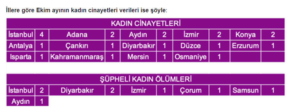 Kadın Cinayetlerini Durduracağız Platformu, Ekim ayında kadına yönelik şiddete ilişkin hazırladığı raporu açıkladı. Kadına şiddetin Ekim ayında da arttığı belirtilen raporda, 8’i şüpheli olmak üzere toplam 21 kadının öldürüldüğü belirtildi.