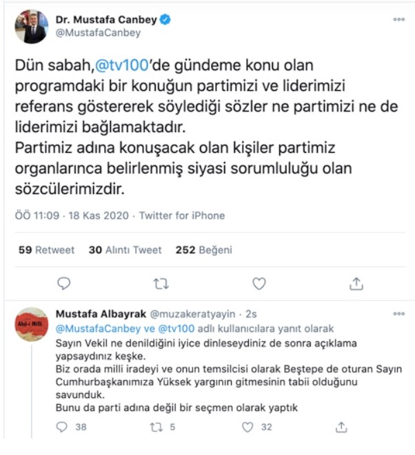 Canbey sosyal medya hesabından, "Dün sabah, TV 100’de gündeme konu olan programdaki bir konuğun partimizi ve liderimizi referans göstererek söylediği sözler ne partimizi ne de liderimizi bağlamaktadır. Partimiz adına konuşacak olan kişiler partimiz organlarınca belirlenmiş siyasi sorumluluğu olan sözcülerimizdir" ifadelerini kullanarak tepki gösterdi.