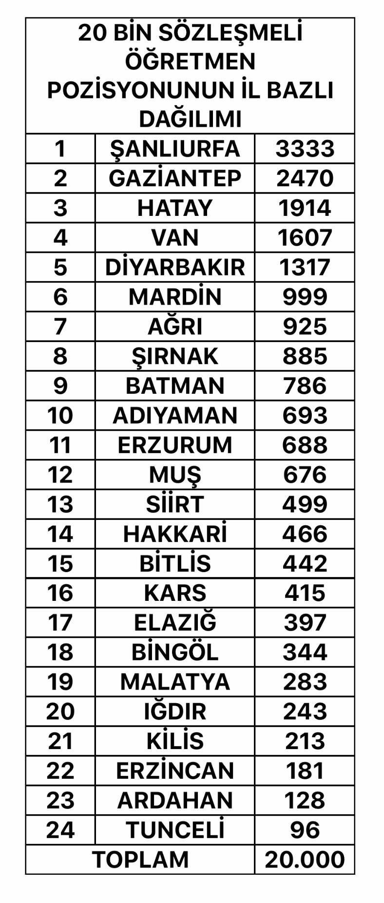 20 bin sözleşmeli öğretmenin atanacağı iller ve kontenjanlar