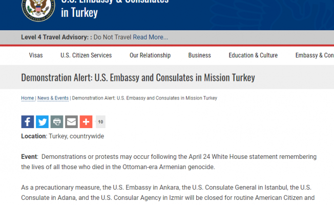 ABD Büyükelçiliği'nden Türkiye'de yaşayan ABD'lilere, "ABD Başkanı Joe Biden’ın dün, 'Ermeni soykırımı' ifadesini kullanmasının ardından gösteriler ve protestolar olabilir" uyarısı yapıldı. Vatandaşlara, "ABD hükümet binalarının yakınlarında bulunmamaları, Amerikalıların veya yabancıların toplanabileceği yerlerde daha dikkatli olmaları" tavsiye edildi.