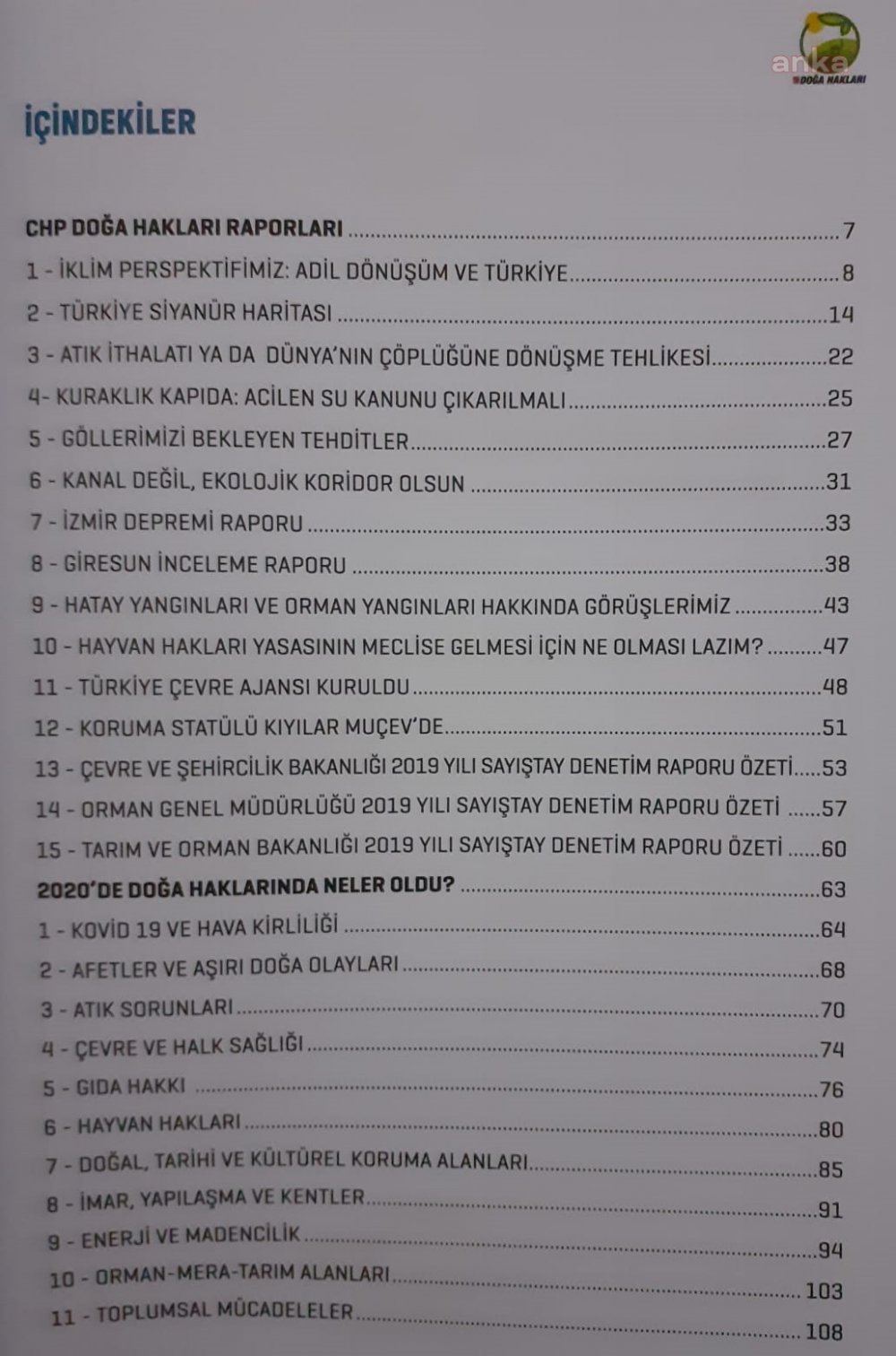 Türkiye'de 2020 yılında depremler, seller, orman yangınları, enerji ve madenler başta olmak üzere yaşanan doğa hak ihlallerini heyet oluşturarak yerinde inceleyen CHP, bu alanda hazırlanan raporları kitaplaştırdı. 'CHP'nin Doğa Hakları Raporları' ve '2020'de Doğa Haklarında Neler Oldu?' ana başlıklarının yer aldığı kitapta, ekolojik krizler ve gelecekte yaşanabilecek sorunlara yer verildi.
