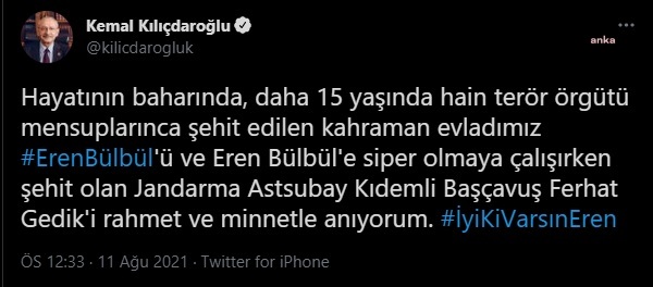 Kemal Kılıçdaroğlu sosyal medya hesabından, 11 Ağustos 2017'de Trabzon'un Maçka ilçesi kırsalında PKK'lı teröristlerle çıkan çatışmada şehit olan Eren Bülbül ve Jandarma Astsubay Kıdemli Başçavuş Ferhat Gedik için anma mesajı yayınladı.