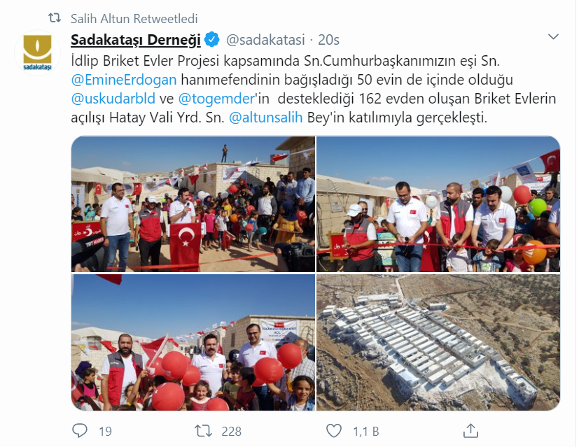 Hatay Vali Yardımcısı Salih Altun, “Bu projeye birçok yerden destek geldi. Bugün de bizzat bağışta bulunan Sayın Emine Erdoğan Hanımefendi’nin 50 adet briket evi tamamlanarak teslim edildi.” dedi.
