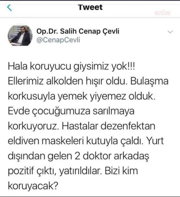 Sosyal medya hesabı üzerinden, “Hala koruyucu giysimiz yok. Alkolden ellerimiz hışır oldu. Bulaşma korkusuyla yemek yiyemez olduk. Evde çocuklarımıza sarılmaya korkuyoruz. Bizi kim koruyacak” sözleri ile isyan eden Doktor Çevli’nin hastanede kaptığı Covid-19 nedeniyle yaşamını yitirmesi büyük üzüntü yaratmıştı. Doktor Çevli’nin vefatının ardından, geriye eşi ve birisi engelli olan üç çocuğu kaldı.