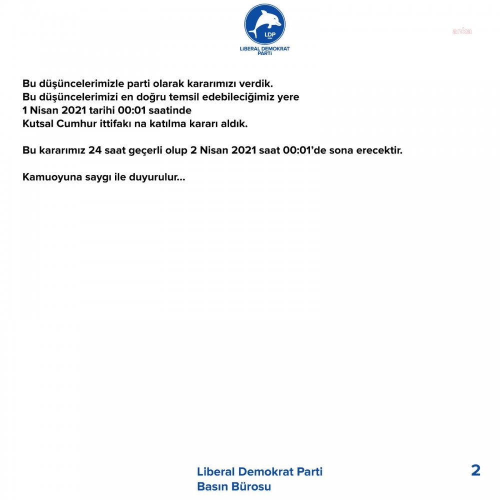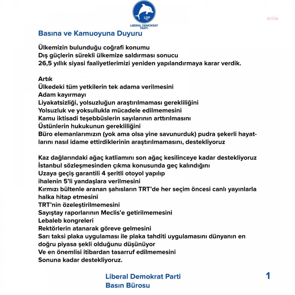 LDP’nin twitter hesabı üzerinden 1 Nisan şakası açıklamasında “adam kayırmayı, lebalep kongreleri, tek adam rejimini, büro elemanlarının pudra şekerli yaşamlarını destekledikleri için bu düşüncelerini en iyi hayata geçirecekleri yerin ‘Kutsal Cumhur İttifakı’ olduğuna karar verdiklerini” bildirdi. LDP’nin açıklaması şöyle: