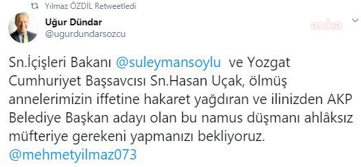 Dündar, Twitter hesabından “Ölmüş annelerimizin iffetine hakaret yağdıran ve ilinizden AKP Belediye Başkan adayı olan bu namus düşmanı ahlâksız müfteriye gerekeni yapmanızı bekliyoruz” dedi.