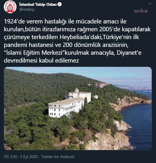 "1924'de verem hastalığı ile mücadele amacı ile kurulan,bütün itirazlarımıza rağmen 2005'de kapatılarak çürümeye terkedilen Heybeliada’daki,Türkiye’nin ilk pandemi hastanesi ve 200 dönümlük arazisinin, "İslami Eğitim Merkezi”kurulmak amacıyla, Diyanet'e devredilmesi kabul edilemez."(anka)