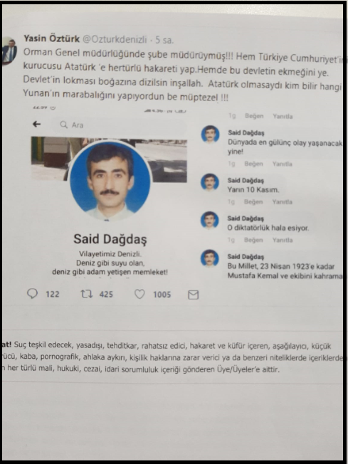 Orman Genel Müdürlüğü Ankara Orman Bölge Müdürlüğü’nde Şube Müdürü olarak görev yaparken, 10 Kasım’da yaptığı Atatürk düşmanı paylaşımlar nedeniyle İYİ Parti Milletvekili Yasin Öztürk’ün, “Orman Genel Müdürlüğü’nde şube müdürüymüş! Hem Türkiye Cumhuriyeti’nin kurucusu Atatürk’e her türlü harkareti yap. Hem de bu devletin ekmeğini ye. Devletin lokması boğazına dizilsin işallah. Atatürk olmasaydı kim bilir hangi Yunan’ın marabalığını yapıyordun be müptezel!” sözleri ile tepki gösterdiği Said Dağdaş, açığa alınınca Öztürk’ün Meclis’teki makamını basarak, fiili ve sözlü saldırıda bulundu.