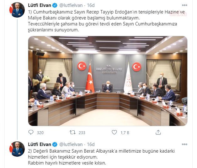 Berat Albayrak’ın istifasının ardından Hazine ve Maliye Bakanlığı’na atanan Lütfi Elvan, “Teveccühleriyle şahsıma bu görevi tevdi eden Sayın Cumhurbaşkanımıza şükranlarımı sunuyorum” dedi.