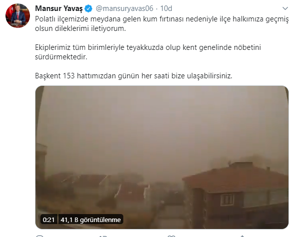 "Polatlı ilçemizde meydana gelen kum fırtınası nedeniyle ilçe halkımıza geçmiş olsun dileklerimi iletiyorum.