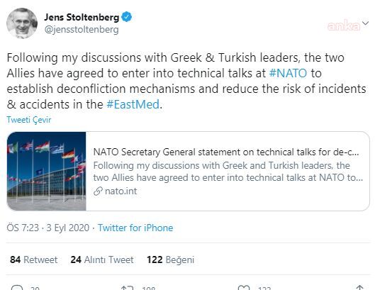 Stoltenberg,"Türk ve Yunan liderlerle yaptığım görüşmeler sonrasında iki müttefik ülke, Doğu Akdeniz'de askeri çatışmayı önleme mekanizmaları kurmak ve kazalarla olayları önleme riskini azaltmak için NATO'da teknik görüşmelere başlamak üzere mutabakata vardı." ifadesini kullandı.