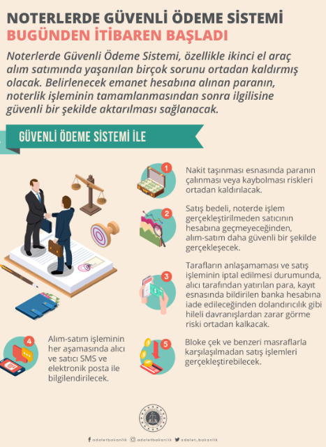 Bakanlık tarafından yapılan duyuruda, güvenli ödeme sisteminin özellikle ikinci el araç alım satımında yaşanılan birçok sorunu ortadan kaldıracağına dikkat çekildi.