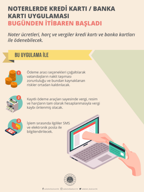 Adalet Bakanlığı, noterlerde güvenli ödeme ve kredi kart ya da banka kartı ile ödeme sisteminin başladığını duyurdu.