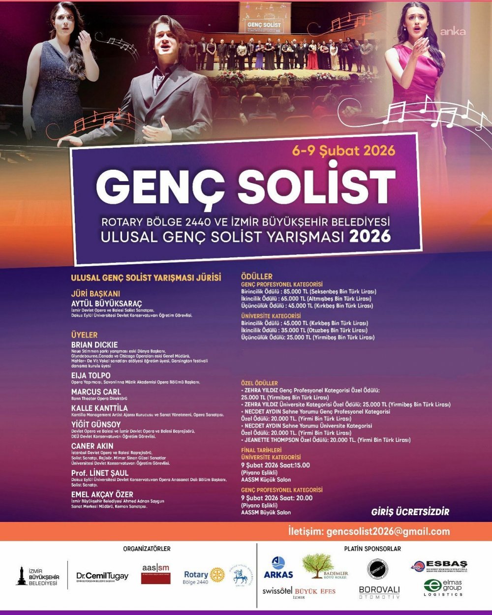 Türkiye’nin dört bir yanından genç opera sanatçılarını buluşturacak Ulusal Genç Solist Yarışması, genç yetenekleri sanat dünyasıyla tanıştırmayı, kariyerlerine ulusal ve uluslararası kapılar açmayı amaçlıyor. Bu yıl video kayıtları üzerinden yapılan ön eleme sonucunda 97 başvuru arasından seçilen 61 yarışmacı İzmir’de sahne almaya hak kazandı. İzmir Büyükşehir Belediyesi, Rotary Bölge 2440 ve Dokuz Eylül Üniversitesi Devlet Konservatuvarı iş birliğinde Ahmed Adnan Saygun Sanat Merkezi’nde yapılacak yarışma “Üniversite” ve “Genç Profesyonel” olmak üzere iki kategoride düzenlenecek. Yarışmanın ikinci elemesi 6 Şubat’ta, yarı final 7 Şubat’ta, “Üniversite” kategorisi finali 9 Şubat’ta saat 15.00’te ve “Genç Profesyonel” kategorisi finali ise 9 Şubat’ta saat 20.00’de gerçekleştirilecek. Finaller halka açık ve ücretsiz olacak.