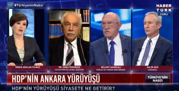 Dün akşam Habertürk TV’de yayınlanan Türkiye’nin Nabzı programının konuğu olan Vatan Partisi Genel Başkanı Doğu Perinçek ile Hukukçu Salim Şen arasında yıllar önce Perinçek ve Öcalan'ın bulunduğu ve Öcalan'ın Perinçek'e çiçek verdiği fotoğrafın tartışması geçti. Doğu Perinçek, PKK'nın kampına düzenlediği ziyaretlerde Abdullah Öcalan’ın kendisine çiçek vermesine yönelik yapılan eleştiriler karşısında bir kez daha açıklama getirmeye çalıştı.