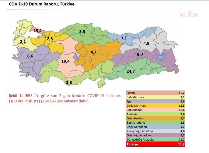 Bakanlığın raporuna göre en çok vaka İstanbul’da görüldü. İstanbul’da son 7 günde eklenen 2 bin 973 vaka ile birlikte toplam vaka sayısı 108 bin 749’a çıktı. İldeki vakaların sayısı 100 bine bölündüğünde 700.7’lik orana ulaşıldı.