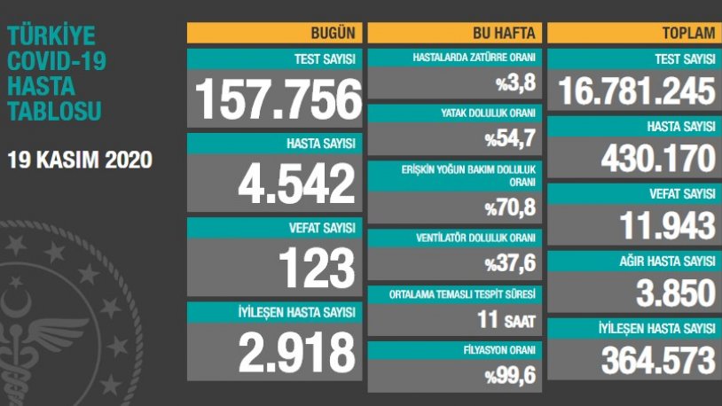 Türkiye'de son 24 saatte 4 bin 542 kişiye yeni tip koronavirüs (Kovid-19) tanısı konuldu, 123 kişi yaşamını yitirdi.