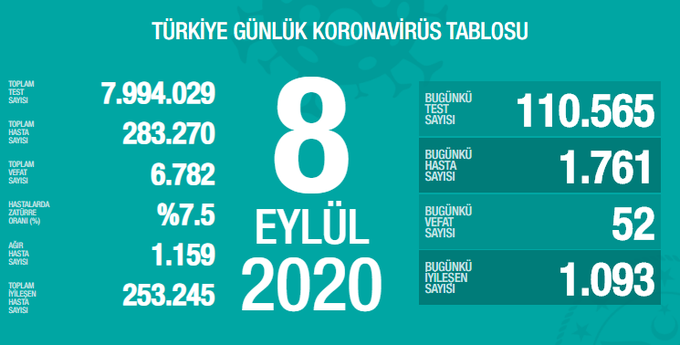 Twitter'dan açıklama yapan Fahrettin Koca ise, "Bugün 110.000’den fazla test yapıldı ve 1.761 yeni hasta tespit edildi. Ağır hasta sayımız artmaya devam ediyor. Kayıplarımız can yakıyor. Bu durumu durduracak olan birlikte tedbirlere uymaktır. Güç birlikte tedbirde." ifadelerini kullandı.