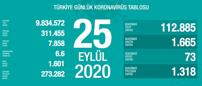 Fahrettin Koca ise sosyal medyada yaptığı açıklamada "Bugün tespit edilen 1.665 yeni hastamız var. Bölgesel çalışmalarımızın neticesini görmeye başladık. Önümüzdeki günlerde yeni hasta sayılarının salgını kontrol altına aldığımızı göstereceğine inanıyorum. Virüsle hep birlikte mücadele edelim." ifadelerini kullandı.
