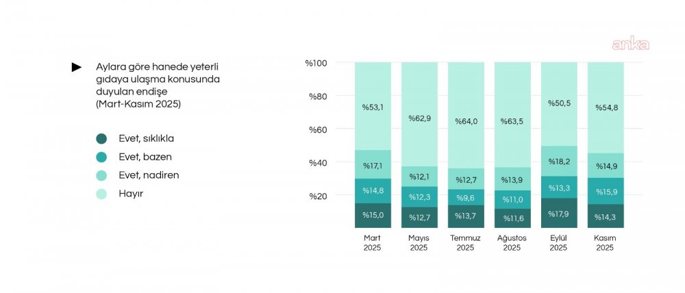 Hanede yeterli gıdaya erişim kaygısı geçtiğimiz yıl Eylül ayında en üst seviyeye ulaştı. Yeterli gıdaya ulaşma konusunda endişe duyduğunu belirtenlerin toplam oranı, Eylül 2025’te yüzde 49,4 olarak ölçüldü. Bu oran içinde “evet, sıklıkla” yanıtını verenlerin oranı yüzde 17,9, “evet, bazen” yanıtını verenlerin oranı yüzde 13,3, “evet, nadiren” yanıtını verenlerin oranı yüzde 8,2 oldu. Yılın son aylarında hanede yeterli gıdaya ulaşma konusunda endişe duyduğunu belirtenlerin toplam oranı Kasım 2025’te yüzde 45,1 olarak ölçüldü.