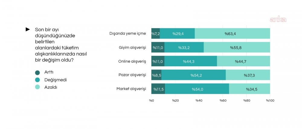 Son bir ayda dışarıda yeme- içme ve giyim harcamalarında da belirgin bir daralma yaşandı. Katılımcıların yüzde 63,4’ü son bir ayda dışarıda yeme içme alışkanlıklarında düşüş olduğunu söyledi. Katılımcıların yüzde 55,8’i giyim alışverişlerinde azalma olduğunu, yüzde 11’i artış olduğunu, yüzde 33,2’si ise değişmediğini kaydetti.