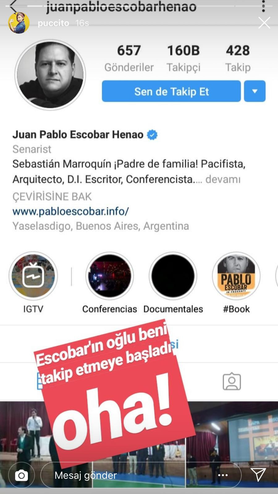 Kamuoyunda 'Pucca' olarak bilinen ve Pablo Escobar hakkında attığı bir tweet sebebiyle uyuşturucuya özendirme suçundan 5 yıl 10 ay hapis ve 66 bin 666 lira para cezasına çarptırılan Pınar Karagöz, dün Instagram hesabından yaptığı paylaşımda, Escobar’ın oğlu Juan Pablo Escobar Henao'nun kendisini takip etmeye başladığını duyurdu.