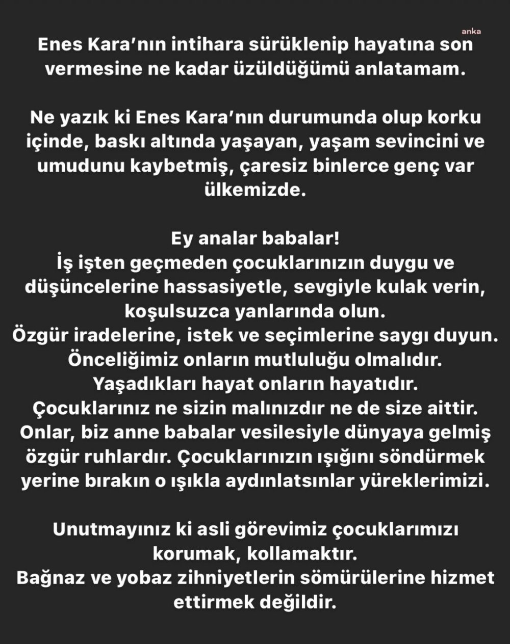 Ne yazık ki Enes Kara'nın durumunda olup korku içinde, baskı altında yaşayan, yaşam sevincini ve umudunu kaybetmiş, çaresiz binlerce genç var ülkemizde.
