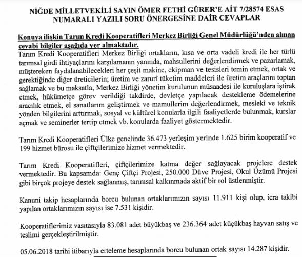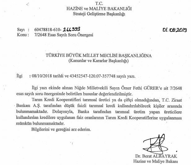 Gürer’e cevap Hazine ve Maliye Bakanı Berat Albayrak’tan geldi. Albayrak, “Tarım Kredi Kooperatifleri tarımsal üretici ya da çiftçi olmadığından, T.C. Ziraat Bankası A.Ş. tarafından düşük faizli tarımsal kredi kullandırılabilecek kişiler arasında bulunmamaktadır” yanıtını verdi.