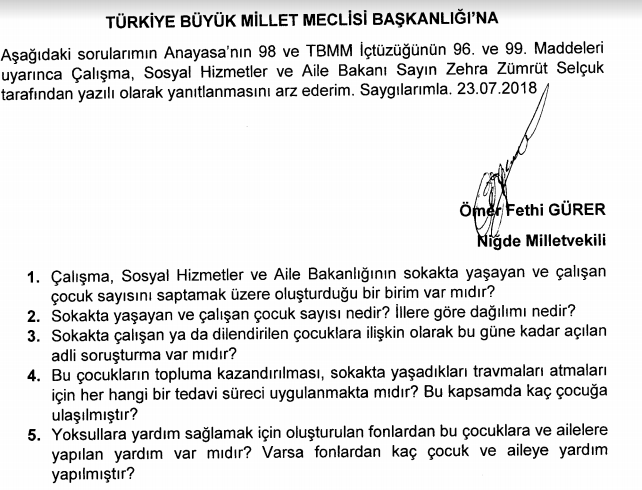 CHP Milletvekili Ömer Fethi Gürer yanıtlanması istemiyle, “Çalışma, Sosyal Hizmetler ve Aile Bakanlığının sokakta yaşayan ve çalışan çocuk sayısını saptamak üzere oluşturduğu bir birim var mıdır? Sokakta yaşayan ve çalışan çocuk sayısı nedir? İllere göre dağılımı nedir? Sokakta çalışan ya da dilendirilen çocuklara ilişkin olarak bu güne kadar açılan adli soruşturma var mıdır? Bu çocukların topluma kazandırılması, sokakta yaşadıkları travmaları atmaları için her hangi bir tedavi süreci uygulanmakta mıdır? Bu kapsamda kaç çocuğa ulaşılmıştır? Yoksullara yardım sağlamak için oluşturulan fonlardan bu çocuklara ve ailelere yapılan yardım var mıdır? Varsa fonlardan kaç çocuk ve aileye yardım yapılmıştır?” şeklindeki sorularını Aile, Çalışma ve Sosyal Hizmetler Bakanı Zehra Zümrüt Selçuk’a yöneltti.