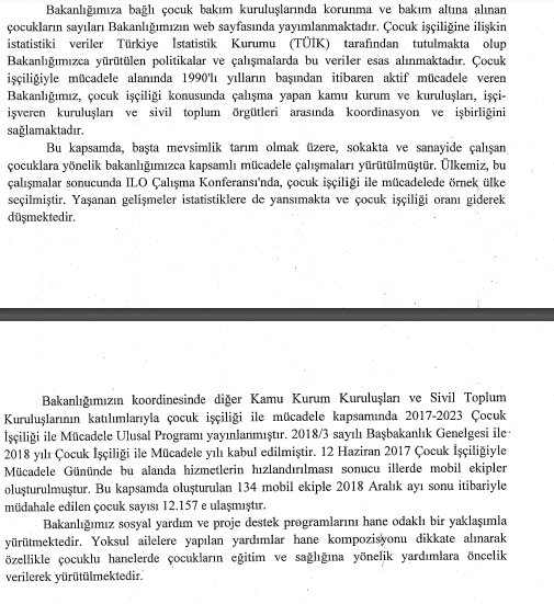 Bu kapsamda, başta mevsimlik tarım olmak üzere, sokakta ve sanayide çalışan çocuklara yönelik bakanlığımızca kapsamlı mücadele çalışmaları yürütülmüştür. Ülkemiz, bu çalışmalar sonucunda ILO Çalışma Konferansı'nda, çocuk işçiliği ile mücadelede örnek ülke seçilmiştir. Yaşanan gelişmeler istatistiklere de yansımakta ve çocuk işçiliği oranı giderek düşmektedir.”
