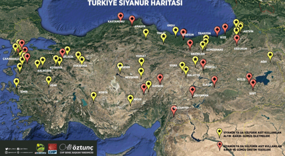 CHP Doğa Haklarından Sorumlu Genel Başkan Yardımcısı Ali Öztunç, “Savaş meydanlarında yapılamayan bugün altın madeni aracılığı ile yapılmaya çalışılıyor. Türkiye, siyanür cehennemine dönüştürülmek isteniyor. Nazi kamplarında biyolojik silah olarak kullanılan siyanür, dağlarımızda, derelerimizde kullanılıyor” diyerek Türkiye’de 37 yerde siyanürle altın araması yapıldığını bildirdi.
