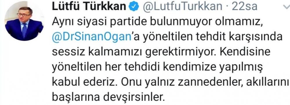 Oğan’ın hedef gösterilmesinden sonra Twitter hesabından açıklama yapan İYİ Parti Grup Başkan Vekili ve Kocaeli Milletvekili Lütfü Türkkan, ‘’Aynı siyasi partide bulunmuyor olmamız Sinan Oğan ‘a yöneltilen tehdit karşısında sessiz kalmamızı gerektirmiyor. Kendisine yöneltilen her tehdidi kendimize yapılmış kabul ederiz. Onu yalnız zannedenler, akıllarını başlarına devşirsinler.’’ açıklamasıyla Oğan’a destek verdi.