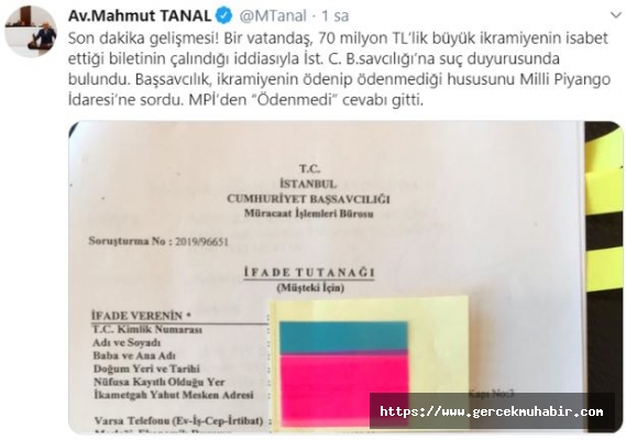 İfade tutanağını da paylaşan Tanal, Başsavcılığın ikramiyenin ödenip ödenmediğini Milli Piyango İdaresi’ne sorduğunu, kurumun “Ödenmedi” cevabını verdiğini açıkladı.