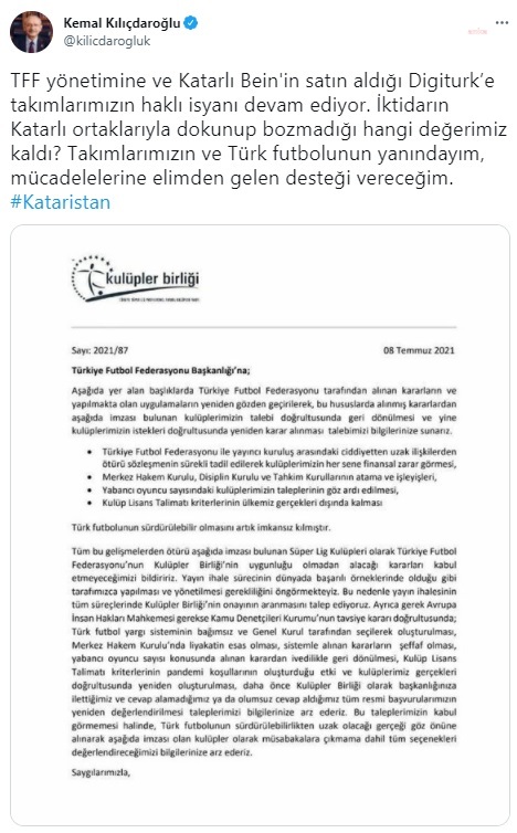 Kılıçdaroğlu, sosyal medya hesabı üzerinden yaptığı paylaşımda, Kulüpler Birliği'nin dilekçesinin bir görselini paylaşarak şunları dedi: