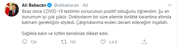 DEVA Partisi Genel Başkanı Ali Babacan, koronavirüs testinin pozitif çıktığını açıkladı. Sağlık durumunun iyi olduğunu belirten Babacan, "Doktorlarım bir süre ailemle birlikte karantina altında kalmam gerektiğini söyledi" dedi.