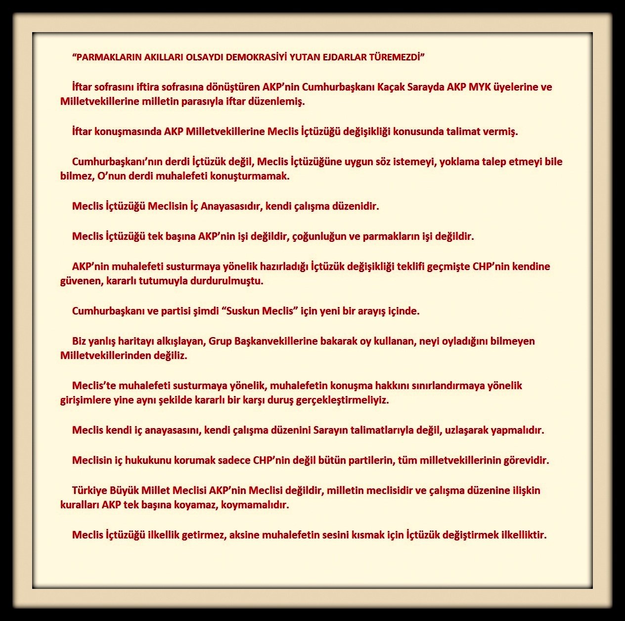 Cumhurbaşkanı Recep Tayyip Erdoğan'ın Cumhurbaşkanlığı Sarayı'nda AKP MYK Üyelerine ve milletvekillerine iftar vermesine siyasi tepkiler büyüyor. CHP Yalova Milletvekili Muharrem İnce, Erdoğan'ın iftarda verdiği içtüzük değişikliği talimatını değerlendirirken, "Cumhurbaşkanı Meclis içtüzüğüne göre söz istemeyi, yoklama talep etmeyi bile bilmez. Onun derdi içtüzük değil, onun derdi muhalefeti susturmak, suskun bir meclis için yeni arayış içindedir. Muhalefeti susturmak ilkelliktir!" ifadesini kullandı. Kişisel twitter hesabı üzerinden iftar yemeğini yorumlayan İnce'nin, "Parmakların akılları olsaydı, demokrasiyi yutan ejderhalar türemezdi" sözleri dikkati çekti. İşte İnce'nin o mesajları:
