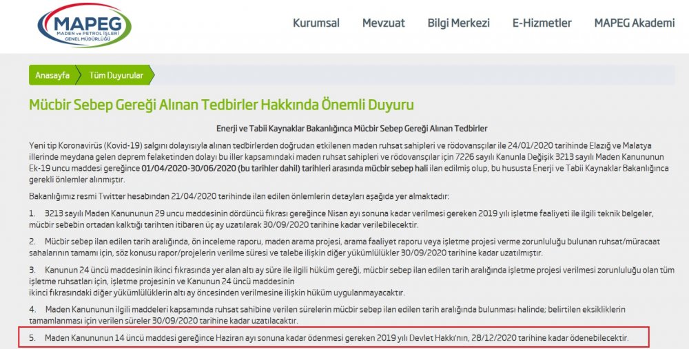 CHP’li Vekil Mahmut Tanal, Enerji ve Tabii Kaynaklar Bakanlığı’nın kararı doğrultusunda maden şirketlerinin 28 Aralık’a kadar ertelenen devlet hakkı borcunun, süre bitiminde tamamen affedilmesi, silinmesi gibi bir adımın atılmasının da ihtimal dahilinde olduğuna dikkat çekerek, şunları söyledi: “Yarın salgının olumsuz etkileri, kriz gerekçe gösterilerek devletin payından vazgeçmesi gündeme getirilebilir. Maden şirketleri çıkıp hep bir ağızdan ‘Zarar ettik, kaybımız var, 28 Aralık 2020’ye ertelenen borcumuz affedilsin. Devlet bize destek versin’ diyebilir. Vatandaşın hakkını kimseye yedirmeyiz. ‘Kaynak yok’ deyip vatandaşa İBAN atarak para isteyeceklerine, maden şirketlerindeki devlet alacakları toplansın ve ihtiyaçlar giderilsin. Alın size kaynak. Ne diye doğayı umursamadan daha fazla kazanma hırsıyla konteynırları altınla, değerli madenlerle dolduran firmalardan parayı almıyorsunuz? Gelirleri bunlara peşkeş çekiyorsunuz, vatandaşa gelince para vermiyorsunuz.”